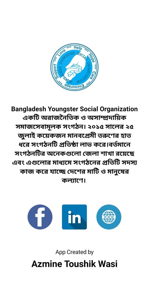 Bangladesh Youngster Social Organization is a non-political & nonracial social organization which is engaged to help distress people.It is a great platform for doing social work & building leadership quality for youths. It has been worked for the development of People Republic of Bangladesh since 25th July,2015.